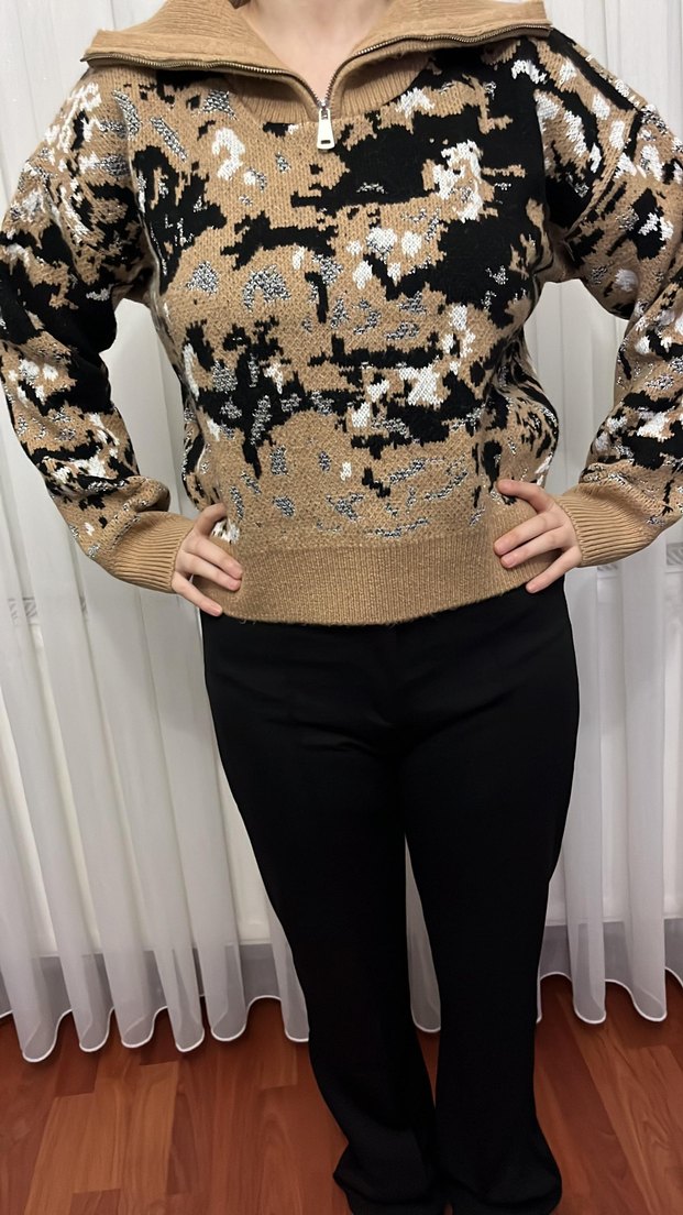 Kahverengi Yılan Desenli Triko Kadın Kazak