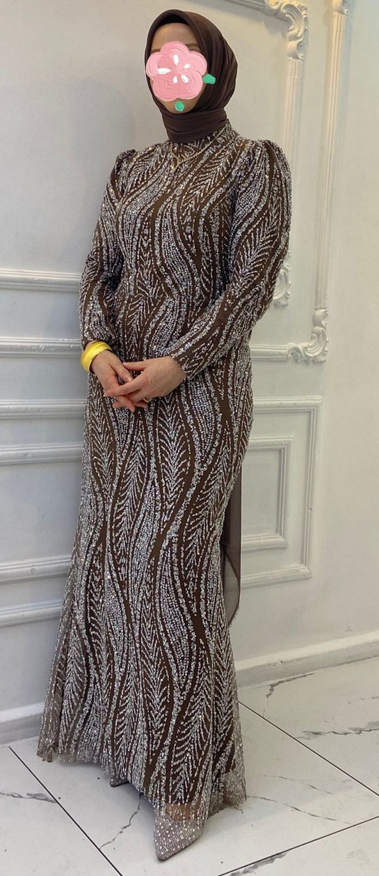 Kahverengi yılan desenli uzun abiye, drapeli tasarımıyla dikkat çeker. Uzun kollu ve tekne yaka, sade ve şık bir görünüm sunar. k. ı. r. a. l. ı. k. t. ı. r. 38 -44 beden aralığındadır şal dahildir