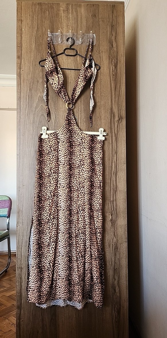 Kahverengi yılan desenli uzun elbise, ince askılı ve halter yakalıdır. Sentetik kumaştan üretilmiş, drapeli ve bohem tarzda bir modeldir. s.m uyumlu