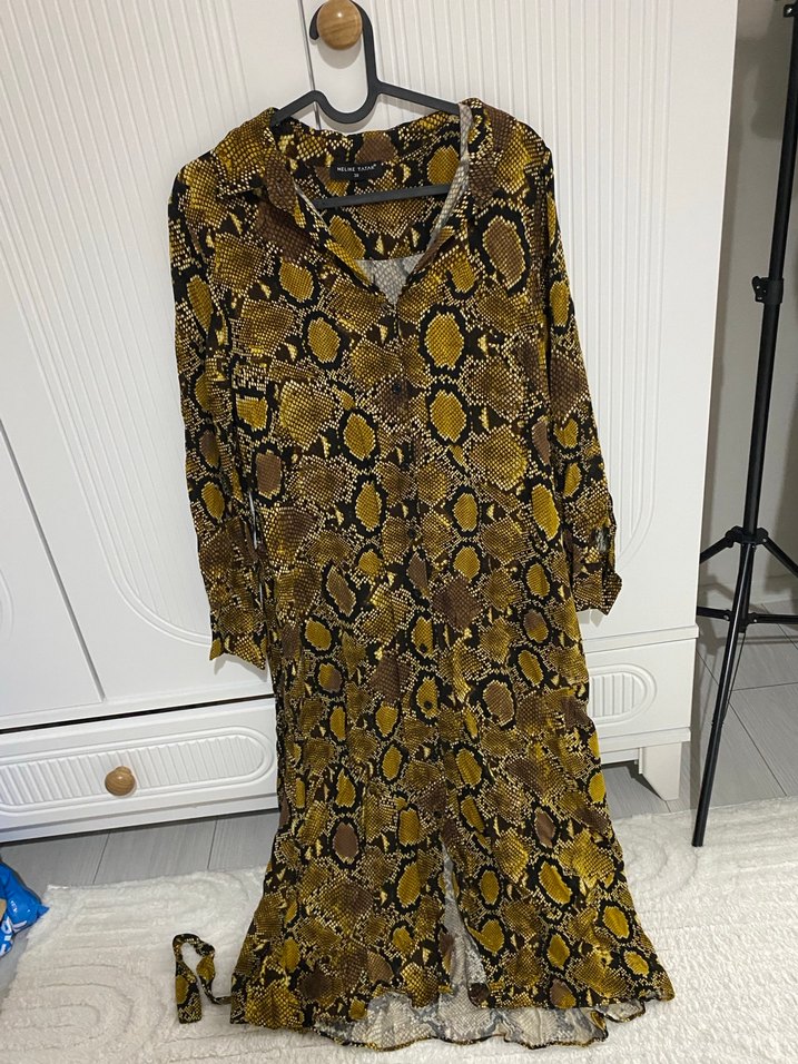 Kahverengi yılan desenli uzun elbise, bol kesim, uzun kollu ve V yakalıdır. Sentetik kumaştan yapılmış, bohem tarzda fırfır detayları vardır, günlük kullanım için uygundur.