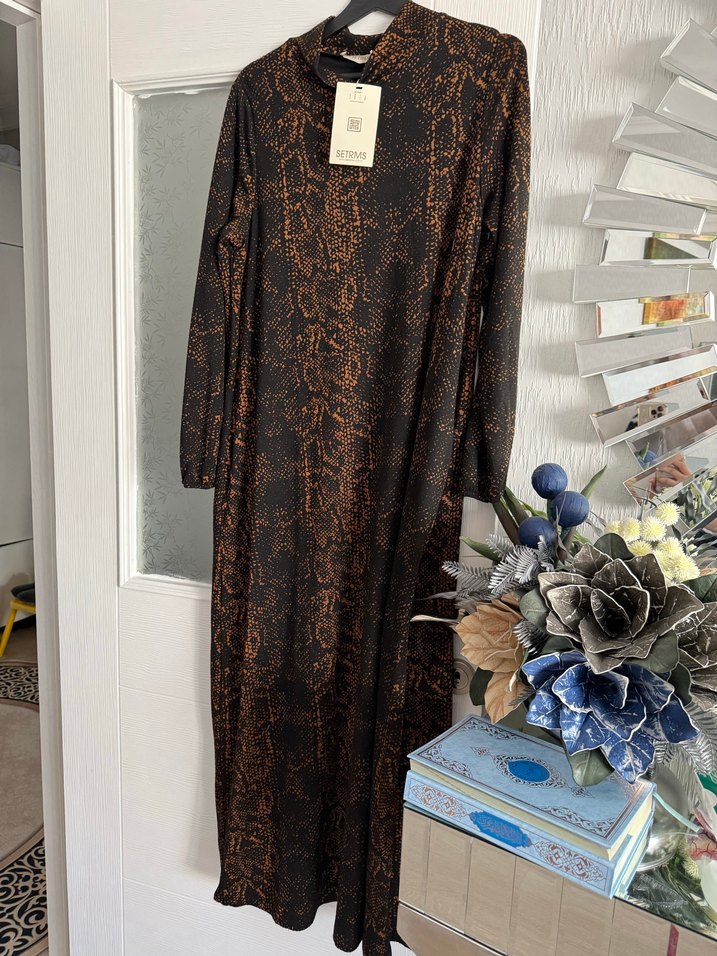 38 beden ama 44 46 bedene kadar olur Koyu kahverengi yılan desenli uzun elbise, bol kesim ve uzun kolludur. Bohem tarzda, yumuşak sentetik kumaştan, günlük kullanıma uygundur.