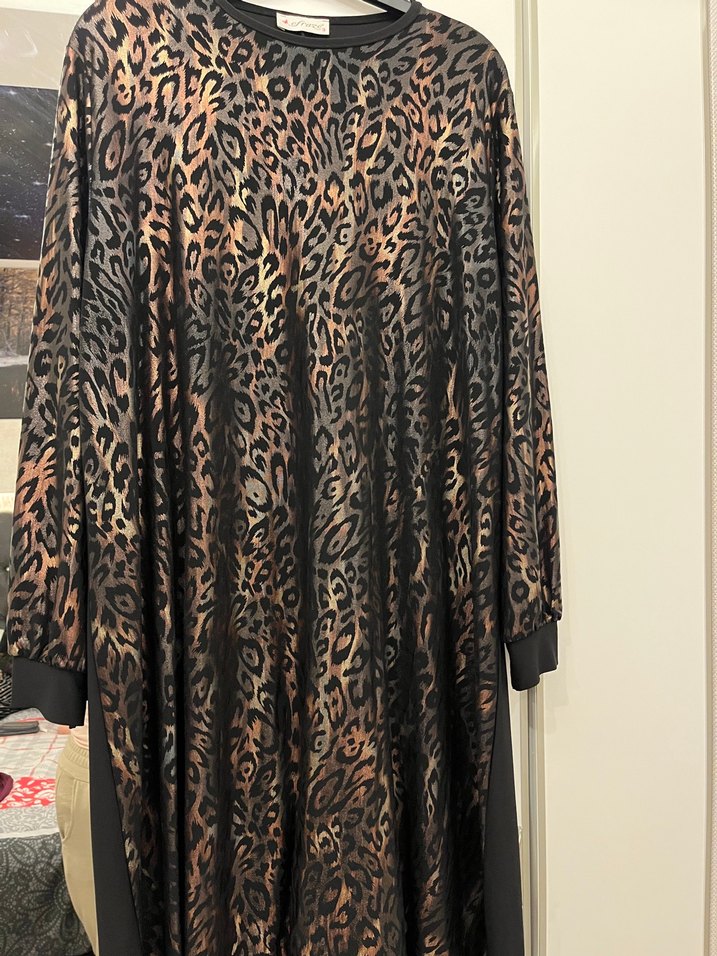 Uzun kollu, bol kesim kadın elbise, koyu kahverengi yılan desenli ve kürk detaylıdır. Yuvarlak yakalı, rahat ve gotik tarzda. 3 numara