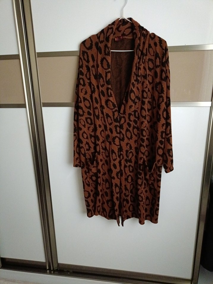 Kahverengi yılan desenli, uzun kollu ve bol kesim kadın hırka , rahat ve modern bir tarz sunar.