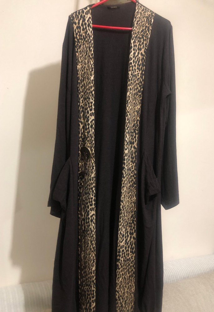 Uzun, bol kesim kadın sabahlık, uzun kollu ve koyu kahverengi renkli yılan desenli detaylara sahiptir. Rahat ve klasik tarzda tasarlanmıştır.