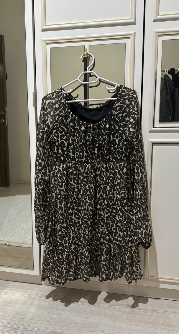 Kahverengi yılan desenli midi boy, uzun kollu, bol kesim elbise. Yuvarlak yaka ve fırfır detaylı, sentetik kumaştan, sokak modasına uygun.