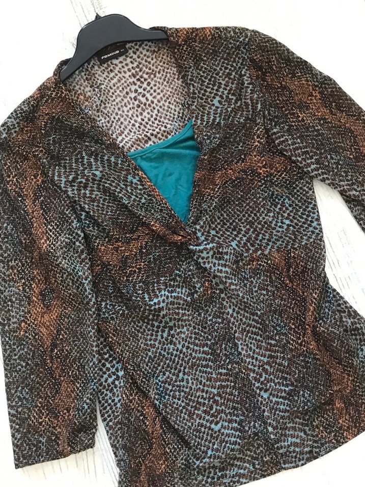 Kahverengi yılan desenli bluz, V yakalı ve düğmeli uzun kolludur. Vücuda oturan kesimi ve midi boyuyla ofis için uygundur.