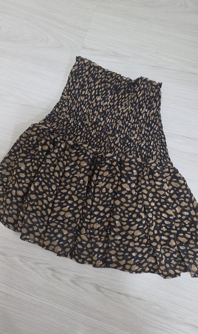 Yumuşak sentetik kumaştan, kahverengi yılan desenli, volanlı ve bol kesim mini etek. Outdoor kullanıma uygun.