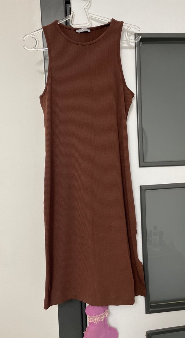 Kahverengi, kolsuz ve yüksek yakalı bu elbise, yumuşak penye kumaştan oluşur
