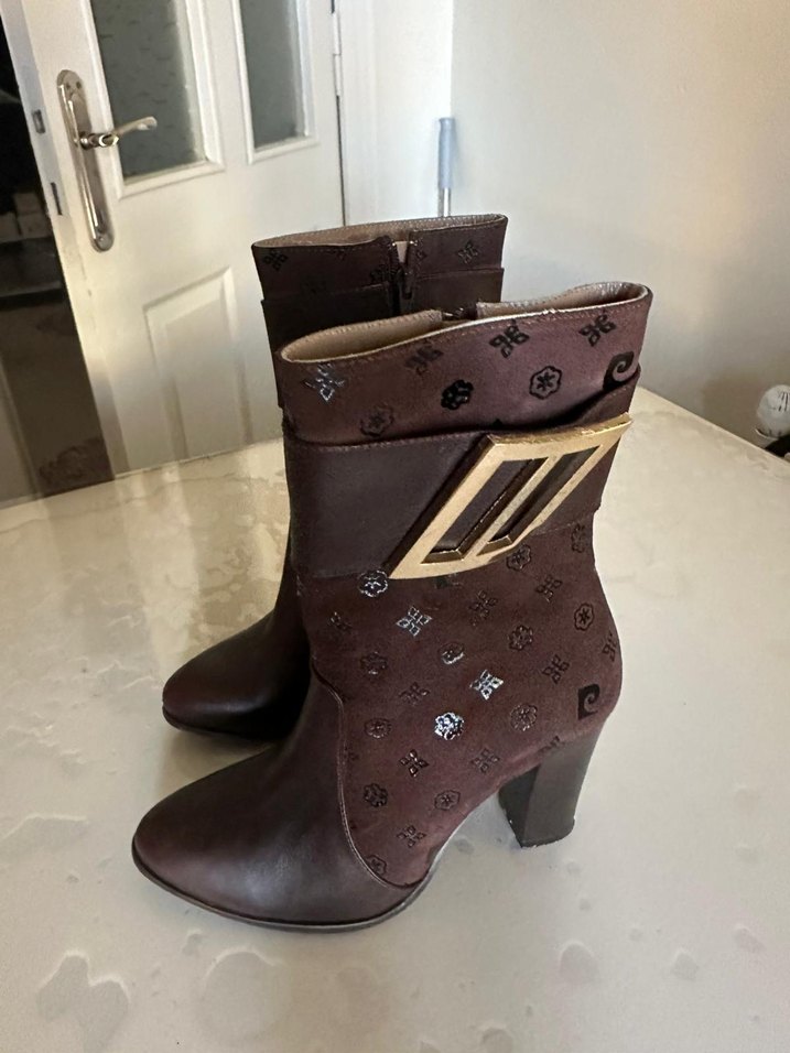 Kahverengi deriden, yılan desenli kadın botları. Yüksek topuklu ve tokalı detaylara sahip, rahat ve çağdaş tarzda. Günlük kullanıma uygun. Hiç kullanılmadı