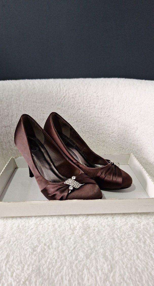 Kahverengi, ipek görünümlü yüksek topuklu abiye ayakkabılar, tokalı detaylarıyla düğünler için klasik ve şık bir seçim. ✨