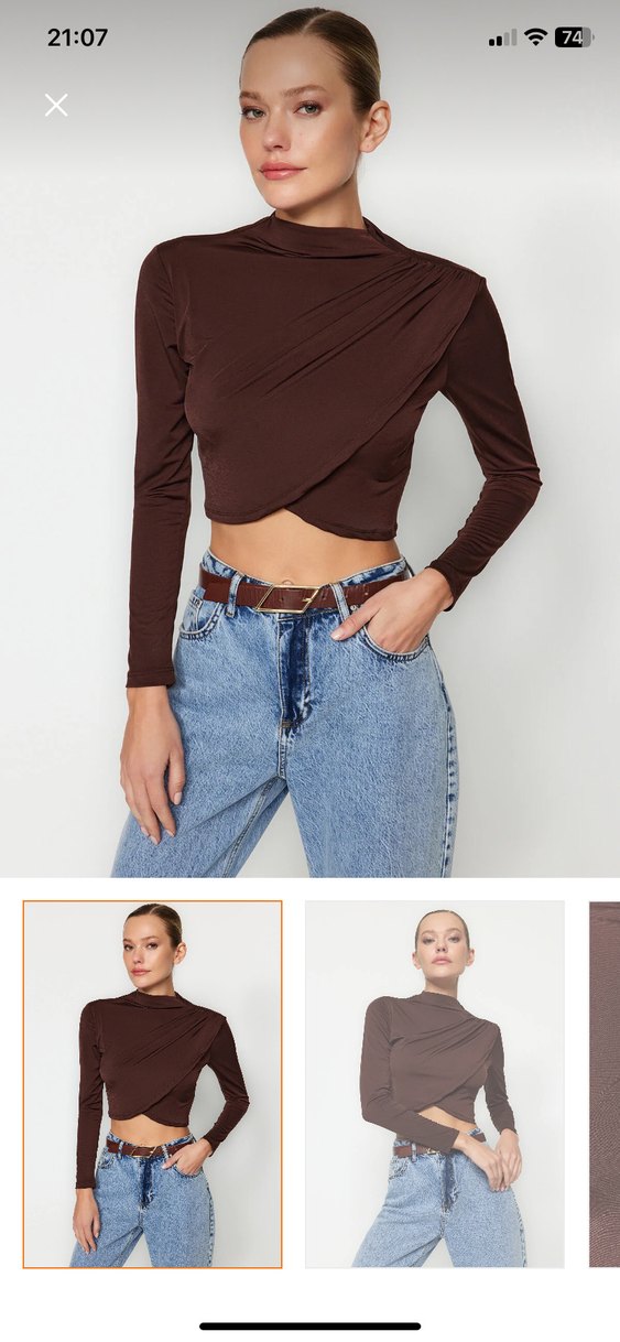 Kahverengi denim kumaştan ve yüksek yakalı, uzun kollu, vücuda oturan kadın bluz. Günlük kullanıma uygun midi boyda ve desensiz.