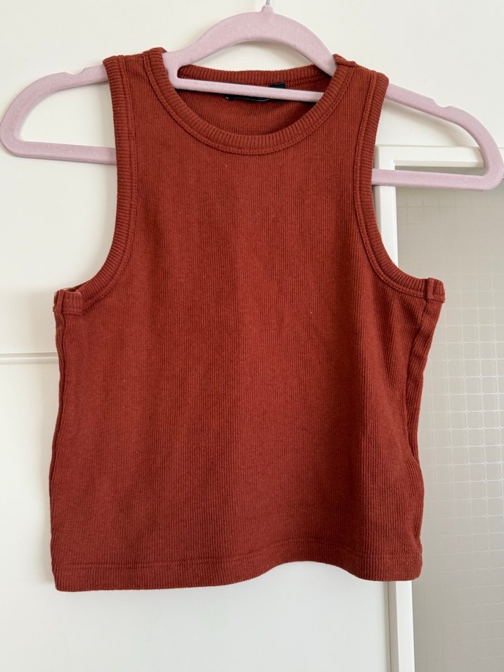 Yumuşak keten kumaştan yapılmış, kahverengi, yüksek yakalı ve vücuda oturan kolsuz atlet. Günlük kullanıma uygun minimalist tarz.