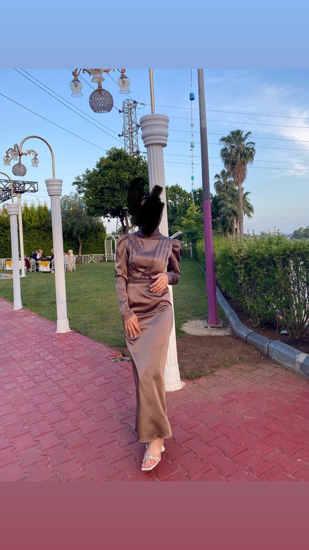 Kahverengi, yüksek yakalı ve uzun kollu, drapeli detaylara sahip, vücuda oturan midi elbise. Avant-garde parti tarzına uygun. ✨ sadece 2 kez giyildi