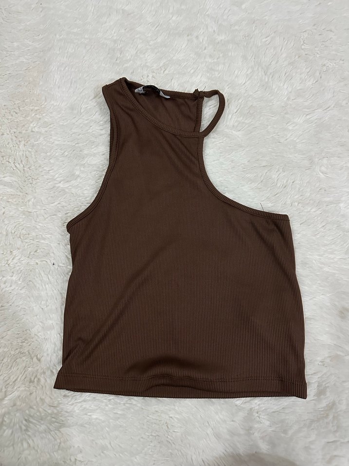 Kahverengi, yüksek yakalı, kolsuz, vücuda oturan kadın atlet. Yumuşak sentetik kumaştan, sade ve desen içermeyen tasarımıyla günlük kullanıma uygun, rahat bir sokak stili sunar.