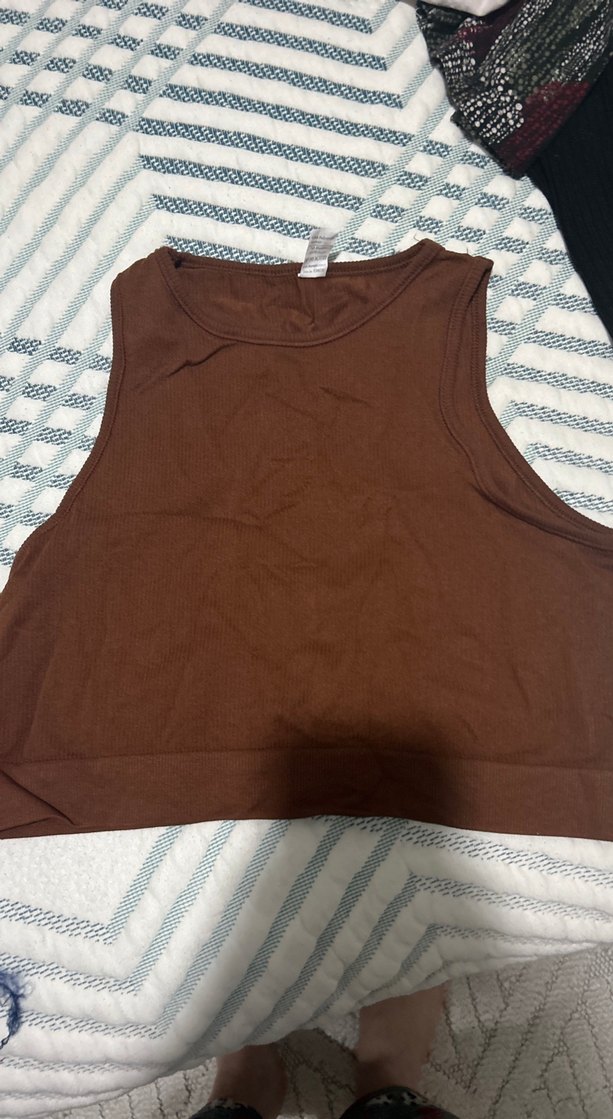 Kahverengi, pamuklu, yüksek yakalı ve kolsuz, vücuda oturan kesimde, günlük kullanıma uygun sade ve şık bir kadın atlet.