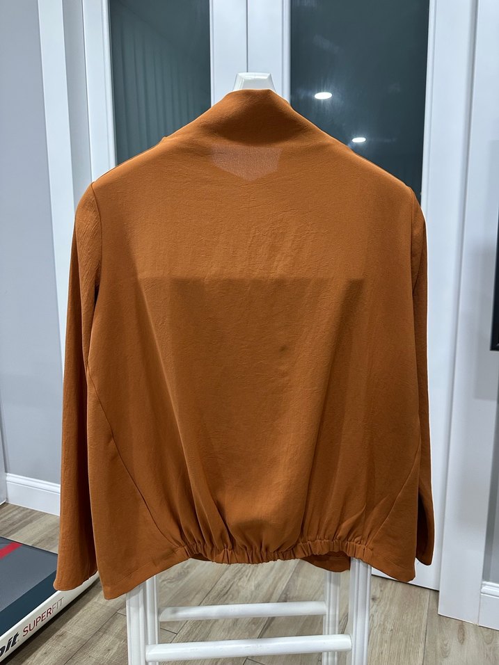 Parlak kahverengi keten kumaştan, yüksek yakalı ve bol kesim uzun kollu, drapeli günlük kullanıma uygun kadın bluz.