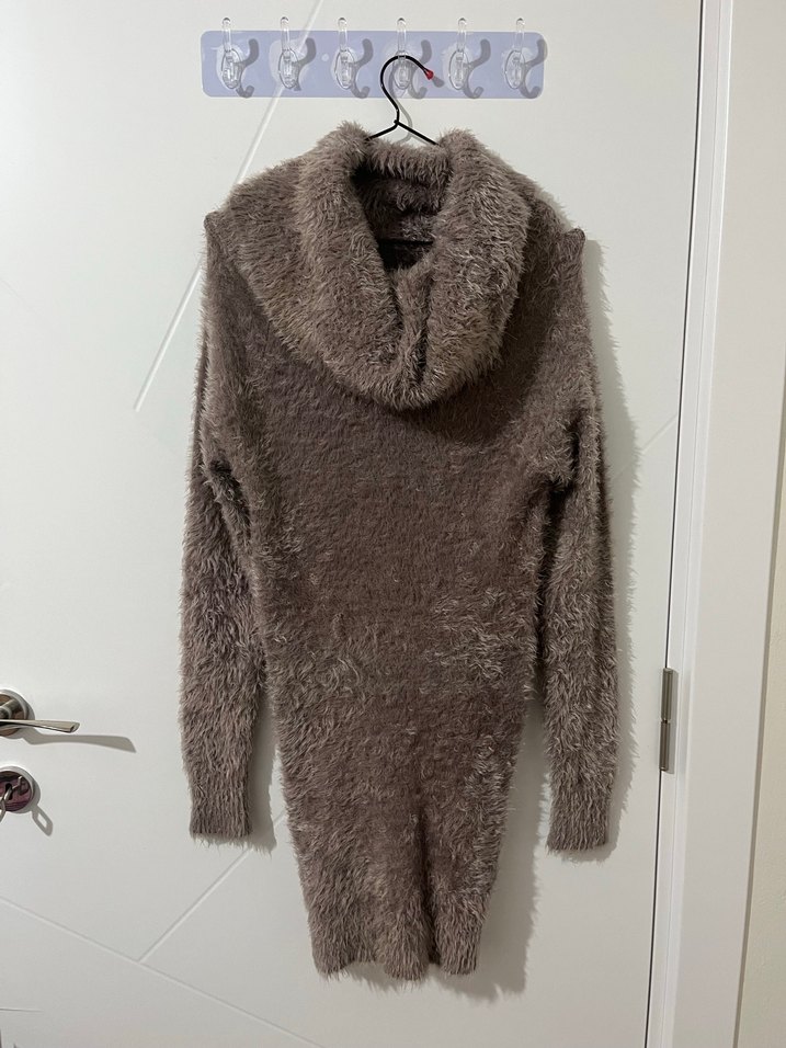 Kahverengi, yüksek yakalı, uzun kollu kadın triko. Yumuşak yün kumaştan, kürk detaylı, midi boy ve düz desensiz, günlük kullanıma uygun şık model.boy 77cm göğüs 72cm