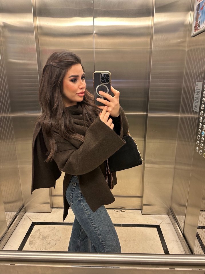 Kahverengi, yüksek yakalı kot ceket, salaş kesimi ve uzun kollu tasarımıyla günlük sokak stiline uyum sağlar.