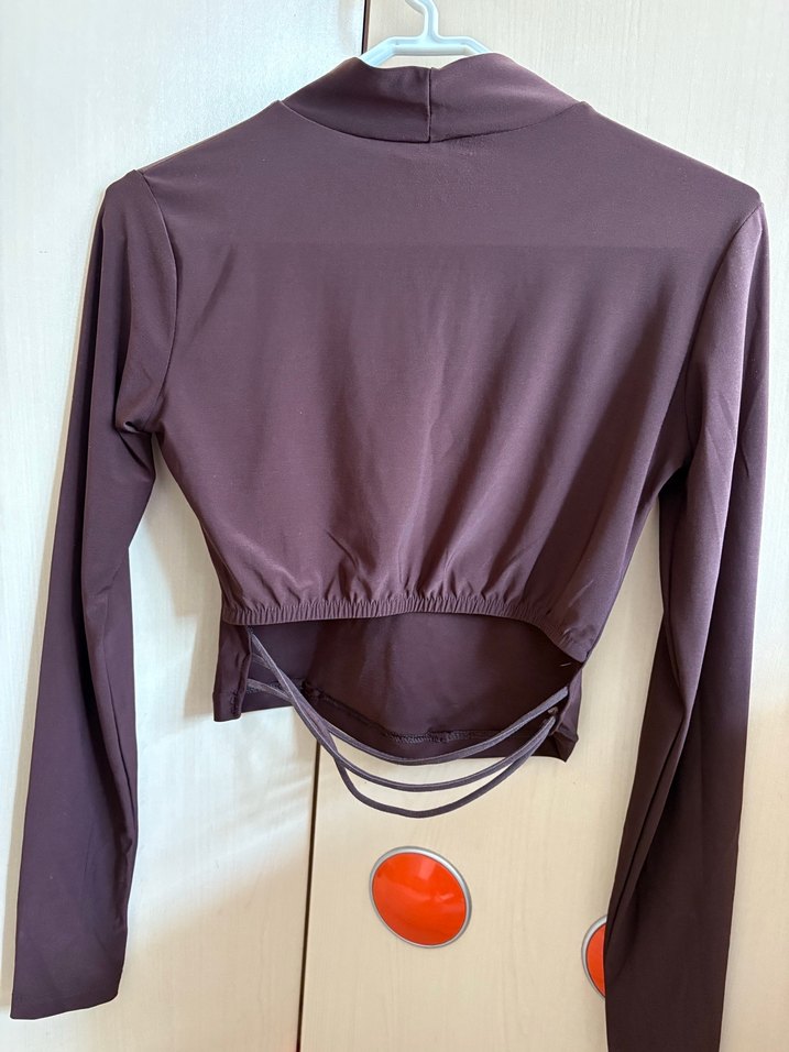 Kahverengi Yüksek Yakalı sırtı çarpraz bluz