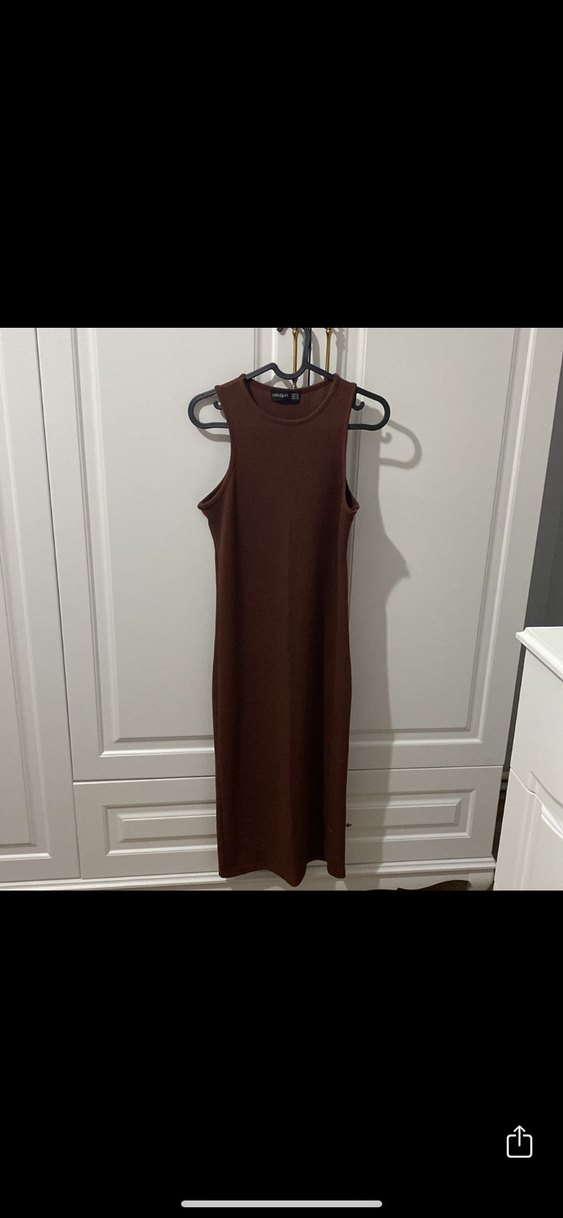 Kahverengi, yüksek yakalı, kolsuz uzun elbise. Düz ve dar kesimli, sentetik kumaştan, günlük sokak stili için uygun.