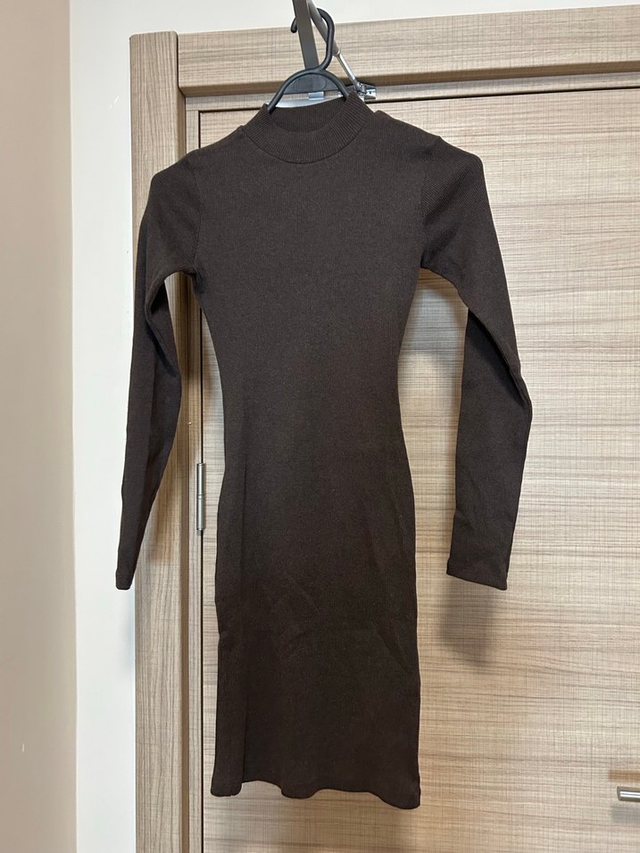 Kahverengi Yüksek Yakalı Uzun Kollu Elbise