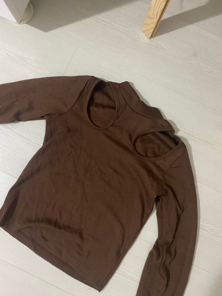 Kahverengi, uzun kollu, yüksek yakalı, yumuşak sentetik kumaştan yapılmış, sade ve minimal tasarımlı, günlük kullanıma uygun kadın kazak.