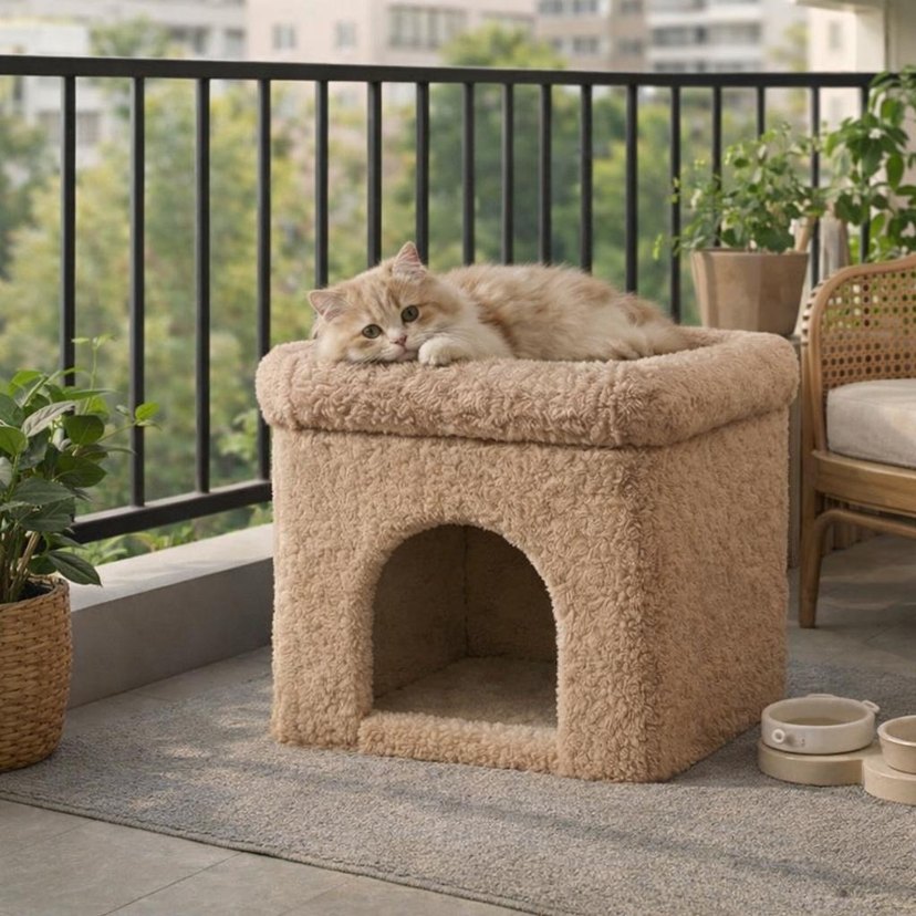Pastel kahverengi, yumuşak dokulu kedi evi. Üstü yastıklı, kedinizin rahatça dinlenmesi için ideal.