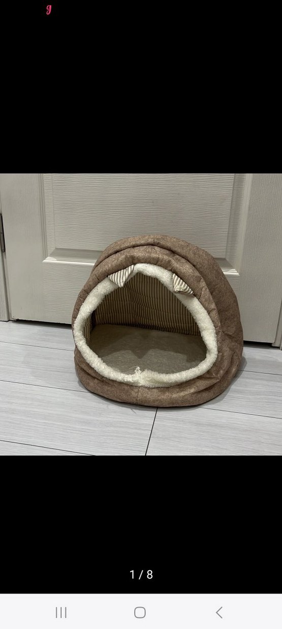 Kahverengi yumuşak iç yüzeye sahip kedi evi, kediler için sıcak ve rahat bir dinlenme alanı sunar. Yuvarlak şekliyle korunaklı bir ortam sağlar.