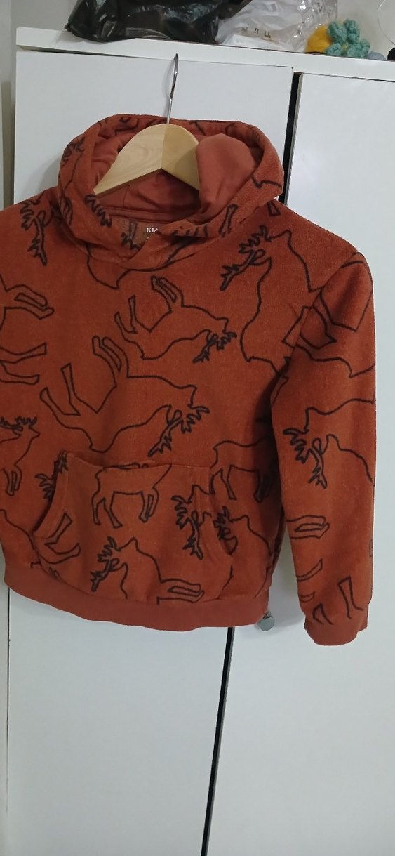 Kahverengi, yüksek yakalı ve uzun kollu erkek sweatshirtü. Bol kesim, baskılı desen ve kürk detaylı, günlük sokak stili için uygun.