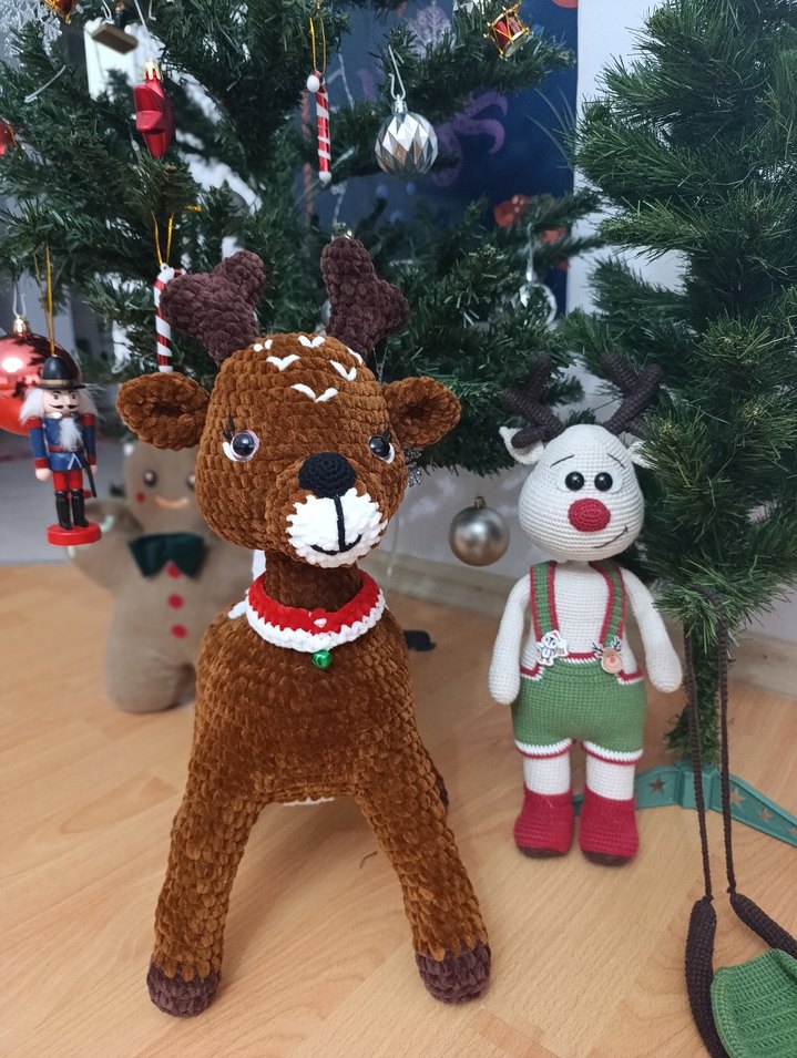 Kahverengi yumuşak geyik oyuncak, renkli detaylarla süslenmiş, yumuşak dokulu ve şık bir dekor ürünü . kadife ip ile işlendi. el ekmeğidir
