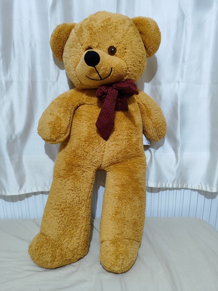 Yumuşak dokulu, kırmızı kareli papyonlu büyük kahverengi peluş ayı oyuncak.