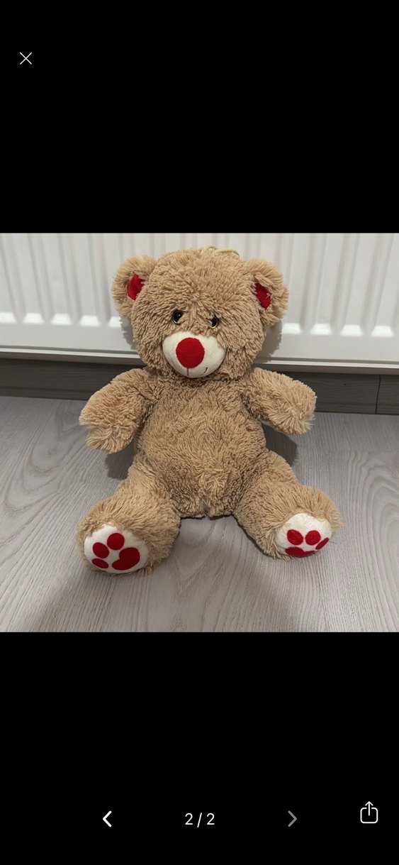 Kahverengi, yumuşak peluş ayıcık, kulak, burun ve patilerde renkli kırmızı detaylara sahip. Rahat ve sarılmalık oyuncak.