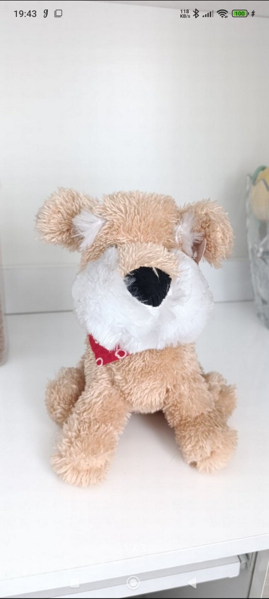 Kahverengi vücutlu, beyaz burunlu ve boynunda kırmızı bandana bulunan yumuşak ve renkli peluş köpek oyuncağı.