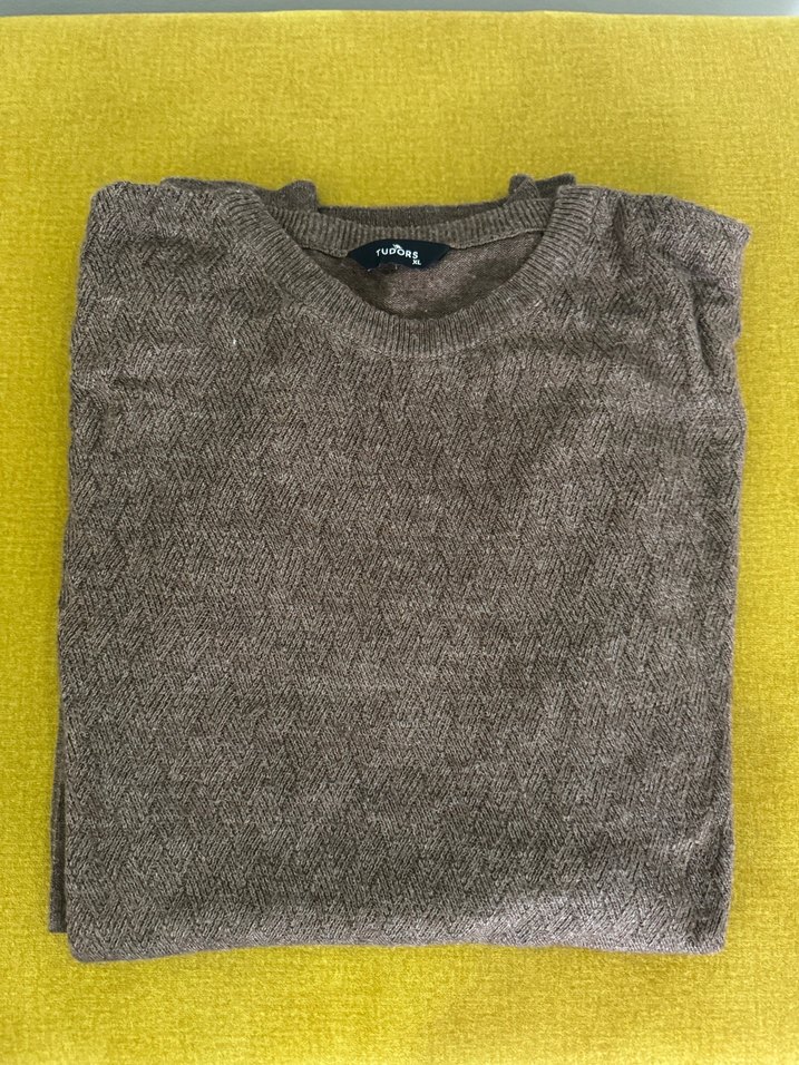 Yumuşak yünden örülmüş, desensiz kahverengi renktedir ve günlük sokak stiline uygundur.