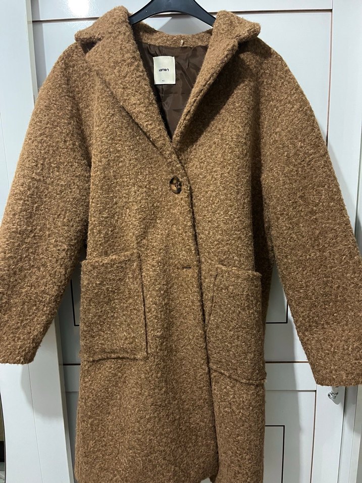 Kahverengi yün kaban, kürk detaylı ve kruvaze yakalıdır. Uzun kollu, normal boyda ve rahat kesimdir. Ofis için uygundur, sade ve şık bir görünüme sahiptir.