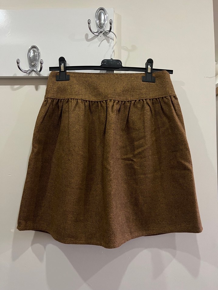 Kahverengi yünden yapılmış, bol kesim ve kemerli mini etek. Kısa boyu ve sade tasarımıyla günlük kullanıma uygundur.