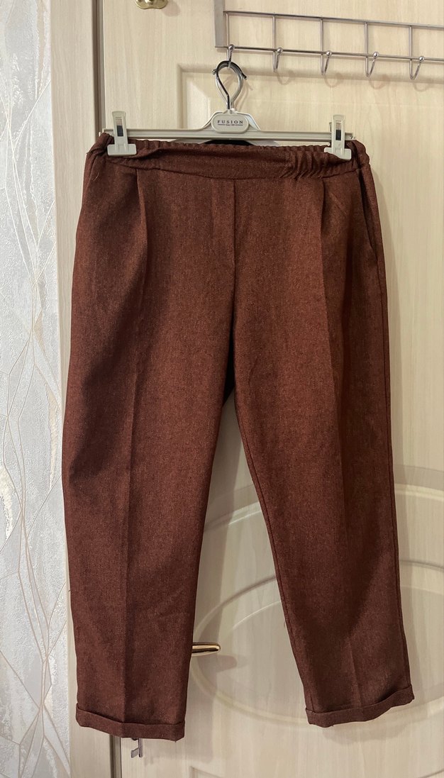Kahverengi yün kumaştan, pilili ve midi boyda, rahat kesim kadın pantolonu. Günlük kullanıma uygun, sade ve konforlu bir model.