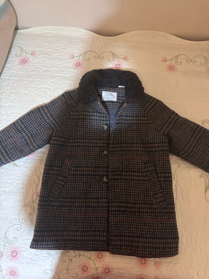 Kahverengi yün kaban, kürklü yakası ve uzun kolludur. Salaş kesim, midi boy, günlük sokak stili için uygundur.