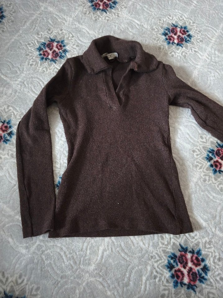 Kahverengi yünlü, uzun kollu, yakalı ve vücuda oturan triko kazak. Örgü yapısı ve rahat sokak tarzı ile günlük kullanıma uygundur.