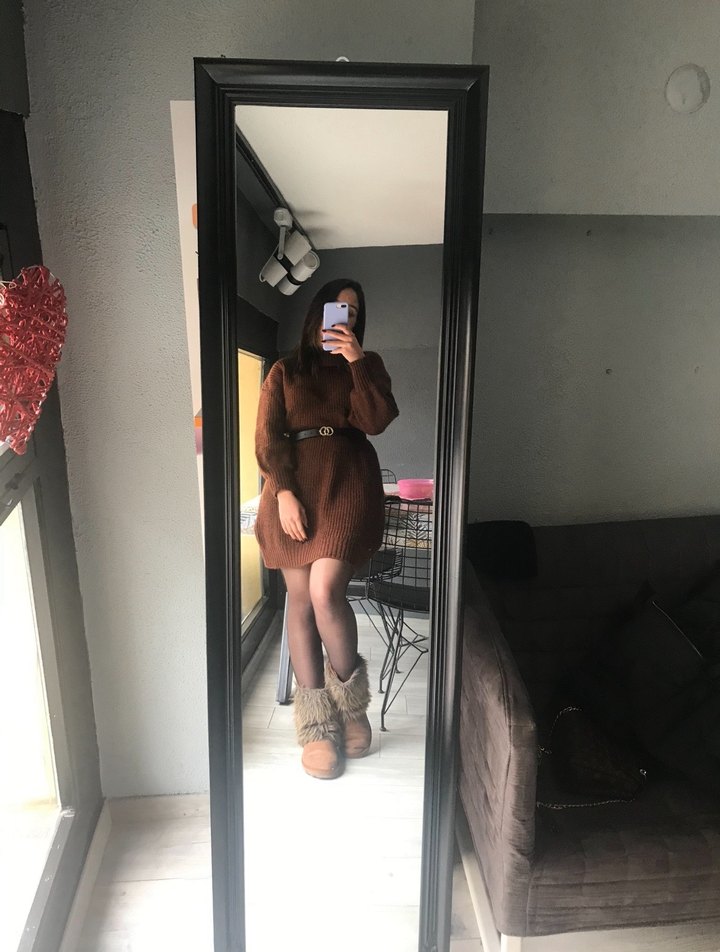 Kahverengi Yünlü Kemerli Triko Elbise