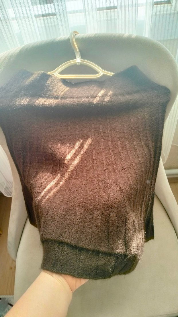 Kahverengi yünlü, kolsuz, bol kesim etek. Parlak dokusu ve rahat yapısıyla günlük kullanıma uygundur.