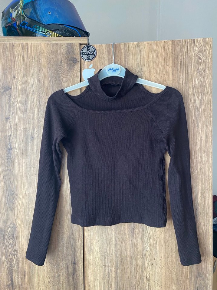 Kahverengi yünlü, yüksek yakalı, uzun kollu, vücuda oturan kadın kazak. Örgü dokusu ve normal boyu ile günlük sokak stiline uygundur.