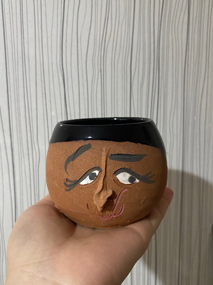 Koyu kahverengi, dokulu seramik yüz desenli kupa. Siyah ve pürüzsüz kenarı kahverengiyle kontrast oluşturuyor. ☕