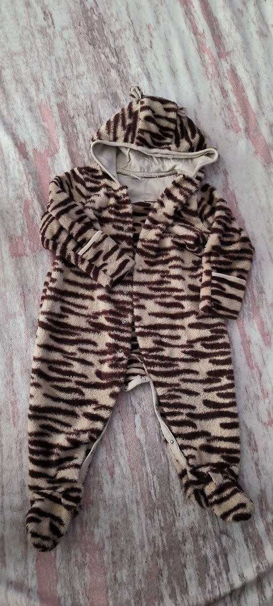 Kahverengi zebra desenli bebek tulumu, yumuşak ve sıcak kumaştan üretilmiştir. Kürklü detayları ve kapüşonu vardır, sokak stili için uygundur.