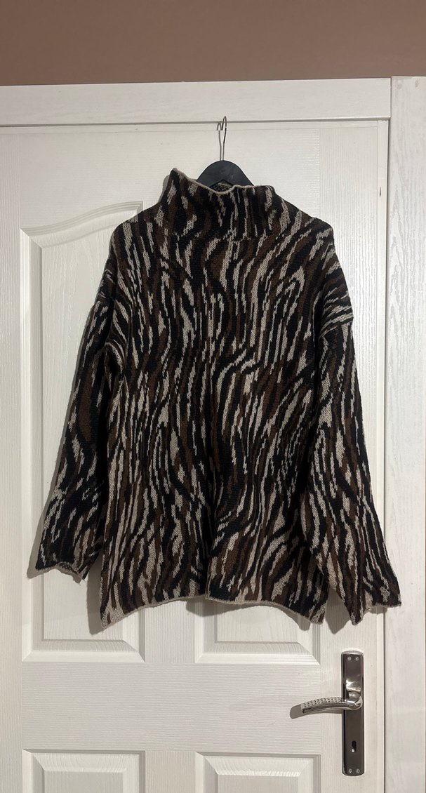 Kahverengi zebra desenli, kürk detaylı, boğazlı ve uzun kollu bu kazak, bol kesim ve midi uzunluktadır. Rahat ve çağdaş bohem tarz sunar .