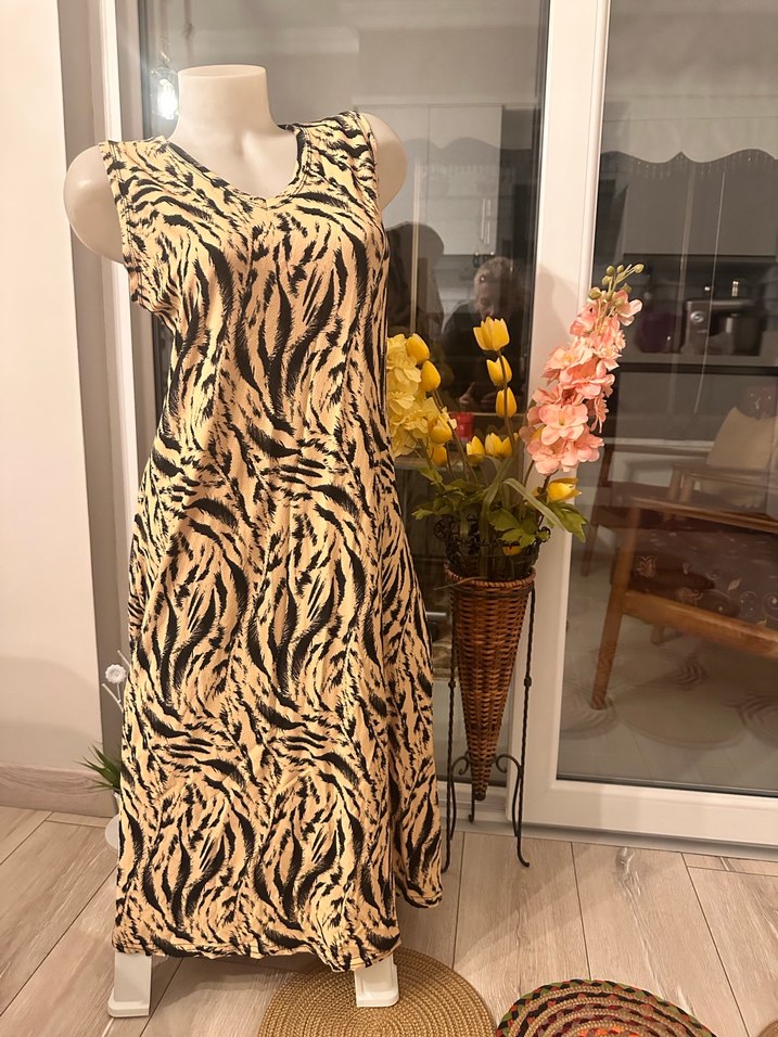 Kahverengi zebra desenli, V yakalı, kolsuz diz altı elbise. Drapeli tasarım ve rahat kesimle günlük kullanım için uygun. Penyedir