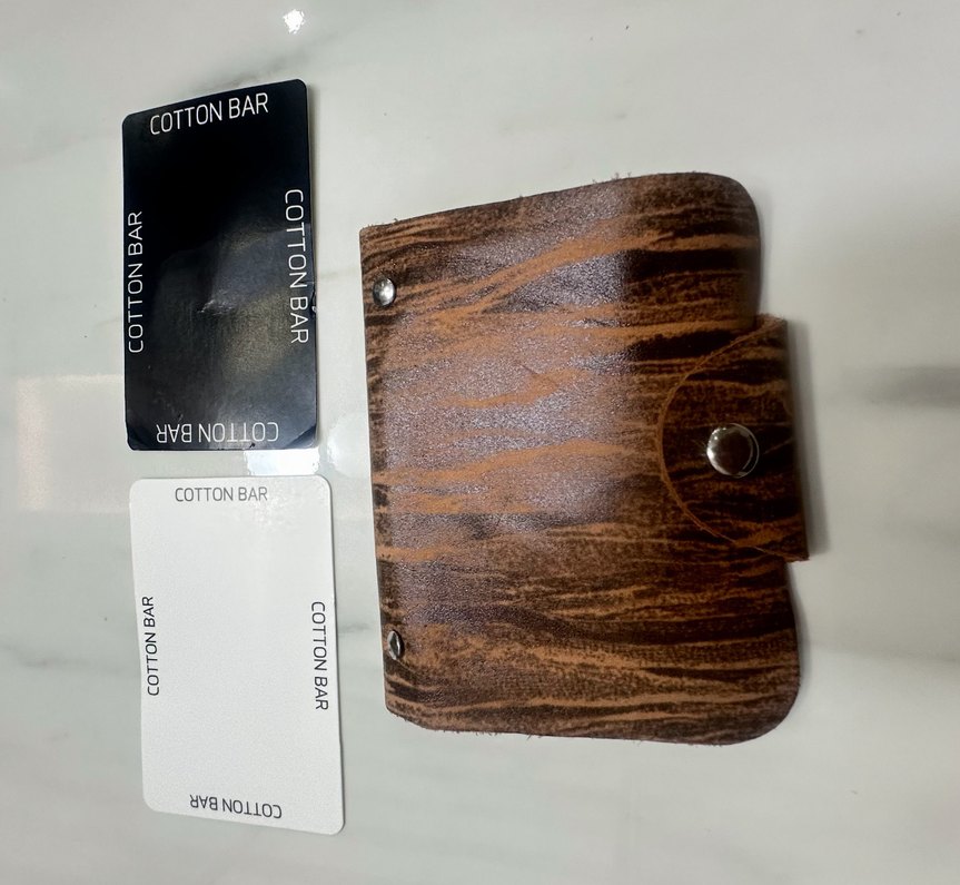 Kahverengi zebra desenli erkek cüzdan, çıtçıtlı kapama ve minimalist bohem tarz sunar. İçinde "COTTON BAR" etiketi bulunur.
