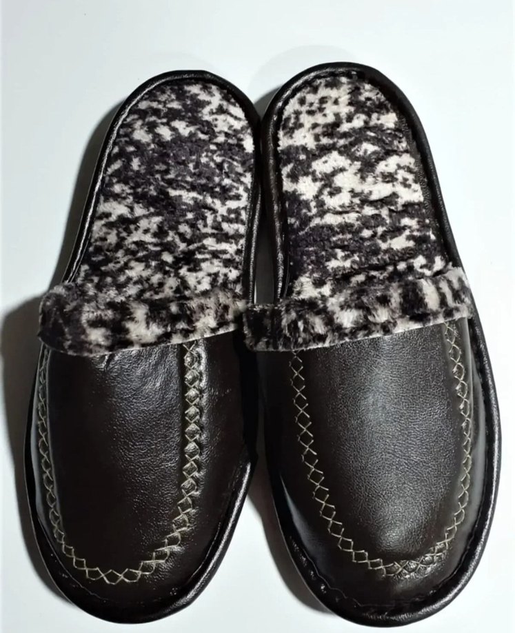 Kahverengi zebra desenli erkek ev terliği, kürklü detayları ve yumuşak iç yüzeyi ile sıcaklık ve rahatlık sunar. Geleneksel tarzda.