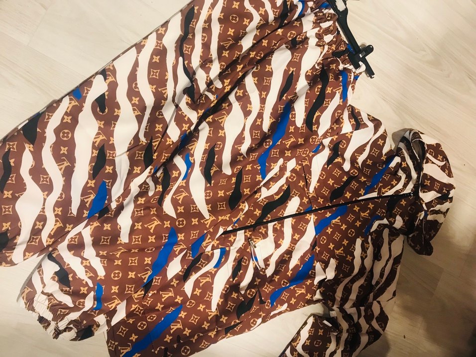 Uzun kesim, V yaka, askılı kollu, dökümlü tasarımlı kahverengi zebra desenli erkek pijama takımı. Rahat ve şık sokak stili için uygun.