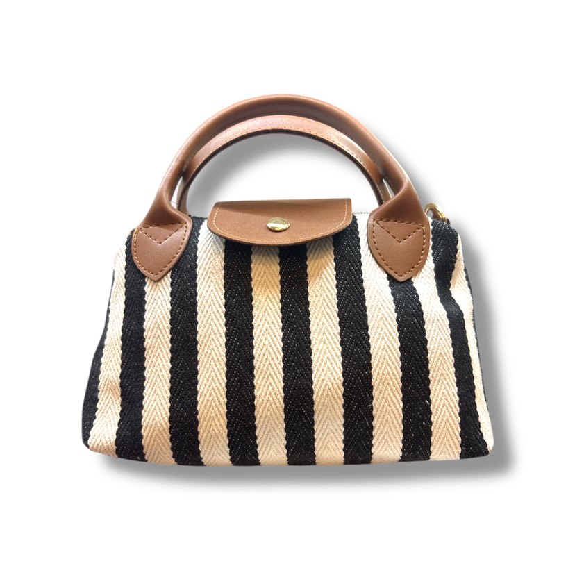 Kahverengi zebra desenli, sentetik kumaştan kadın çantası, tokalı kapak ve yuvarlak saplarla klasik şıklığı çağdaş tarzla buluşturuyor.